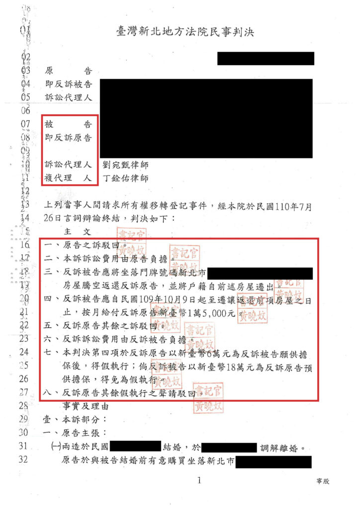 A小姐與B先生離婚後,B先生明明早就知道登記在A小姐名下的房子,自始至終都是A小姐的,竟然向法院主張A小姐名下的房子其實是他的,並要求A小姐「返還」房屋。A小姐本想說雙方曾為夫妻,而同意讓B先生在離婚後還可以暫住在房子內,現在B先生竟然虛構事實對自己提告,實在忍無可忍,因此立即要求B先生離開並將戶籍遷出,卻遭B先生拒絕。A小姐因此委任律師同時針對B先生提告案件進行答辯,並提起反訴要求B先生搬離及遷出戶籍,最後除了法院直接駁回B先生請求外,也完全採納A小姐主張,判決B先生離開並將戶籍遷出,A小姐大獲全勝!
