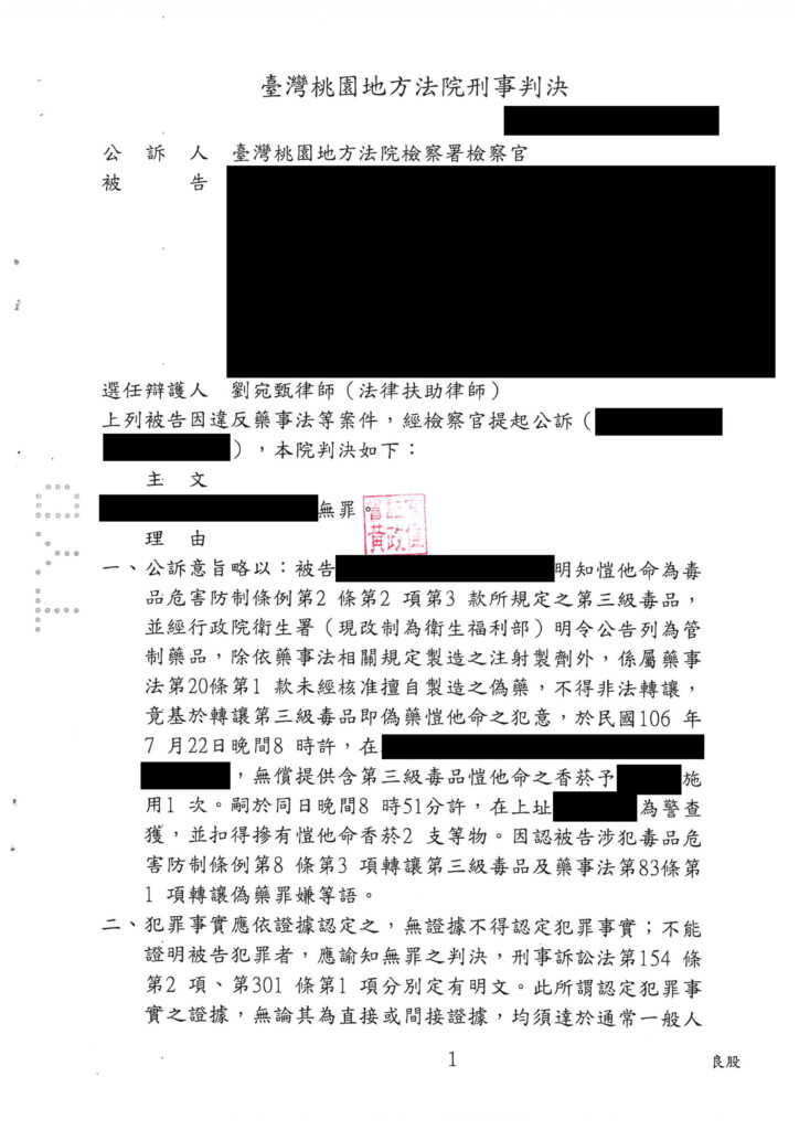 A先生因為遭警察跟友人誤導,而曾於警局供稱自己曾提供含第三級毒品愷他命的香菸給他人,更因此未有第一時間尋求專業法律人員協助。後檢察官就因A先生的說詞,認定A先生有轉讓毒品行為,並將A先生起訴。經過律師審理中努力替A先生辯護,終於讓法官知道A先生是遭人誤導才會這樣說,最終終於替A先生取得無罪判決。